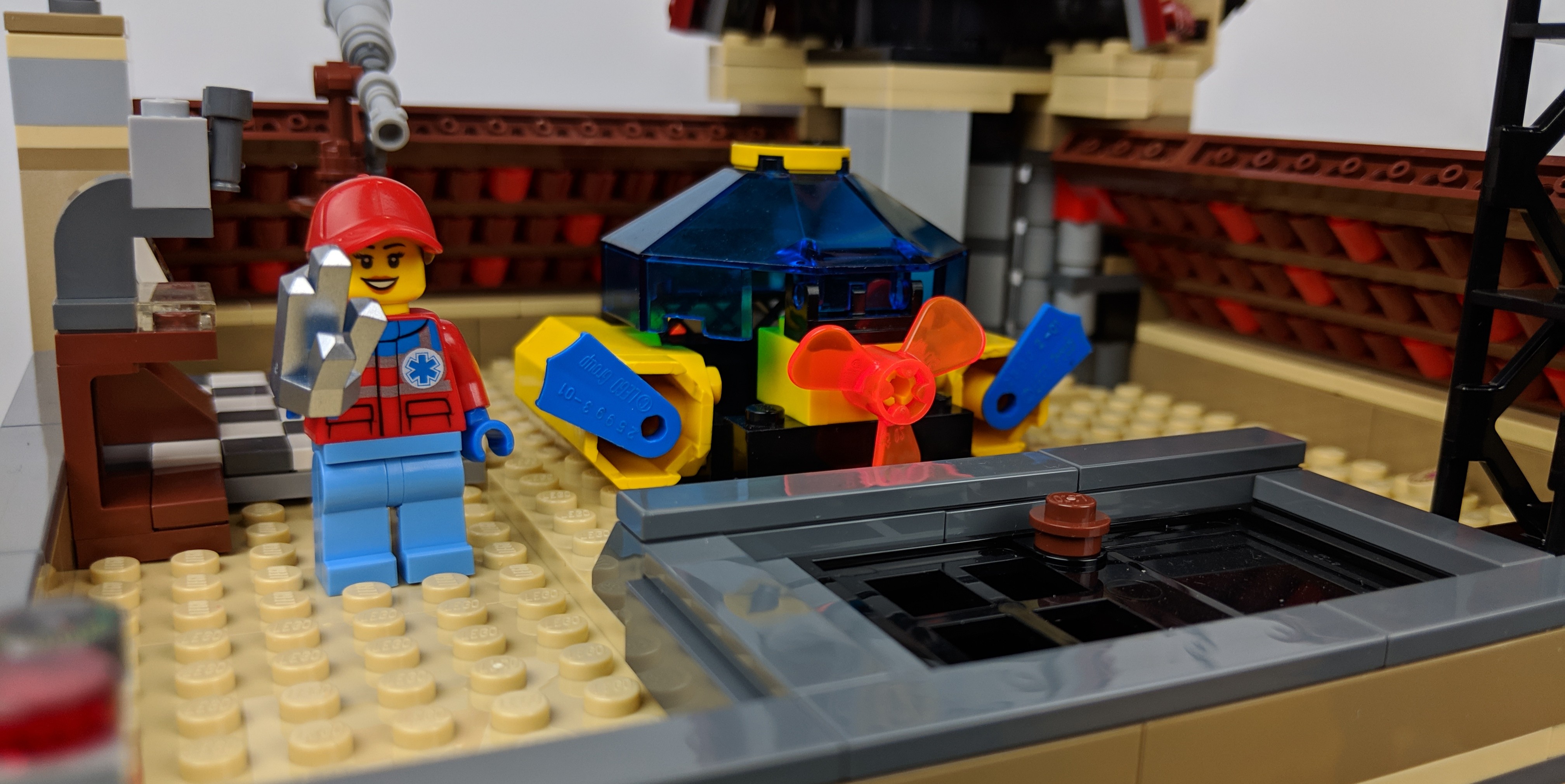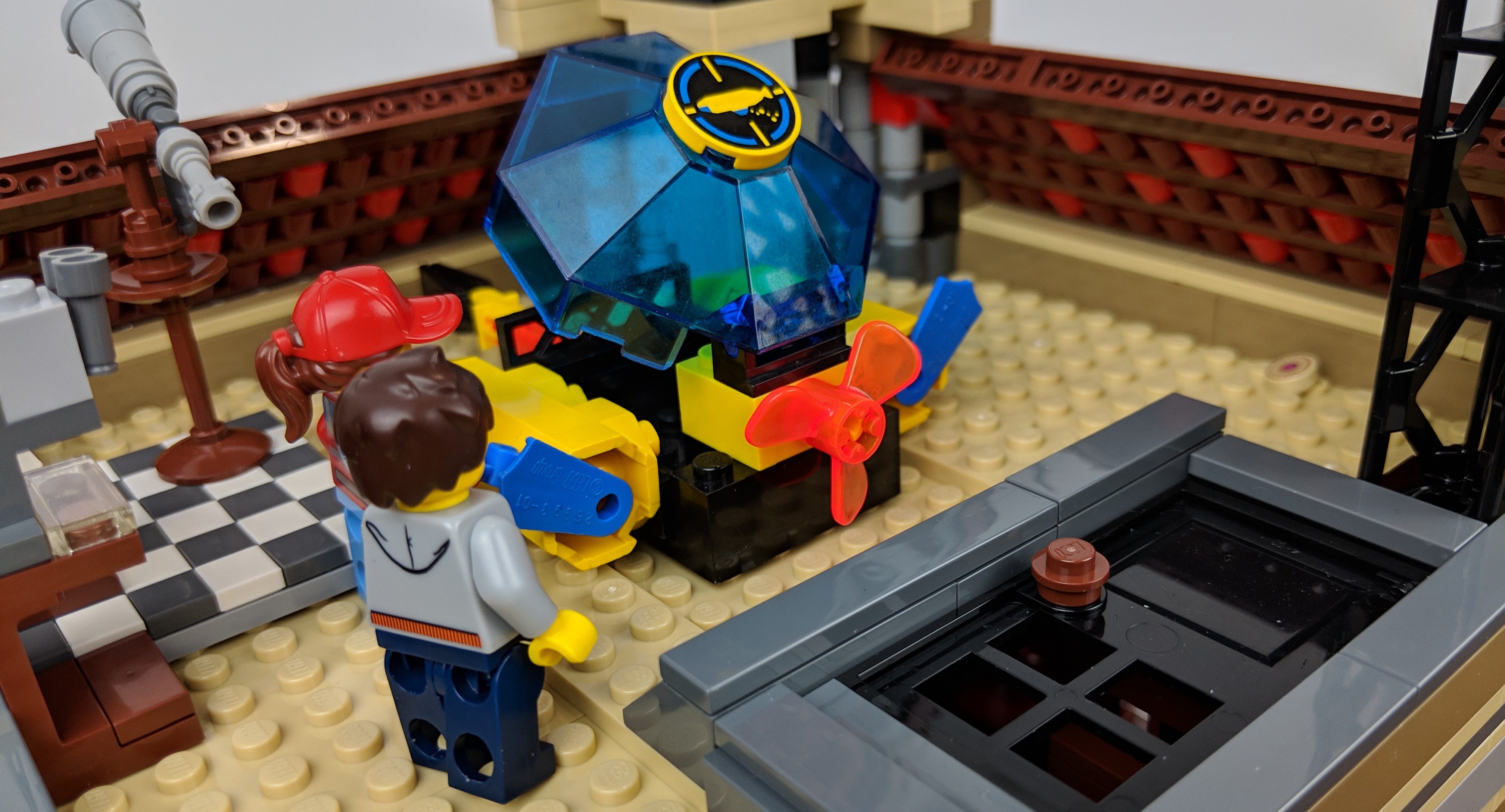 Atop the Mission Control building, Ruby was lifting a large battery pack and heaving it over to the small yellow ship. She opened the ship’s octagonal cockpit and looked inside at the blank controls and wiring. Nothing seemed too broken in here. In fact, it seemed like the little ship may still be able to fly if they could power it.